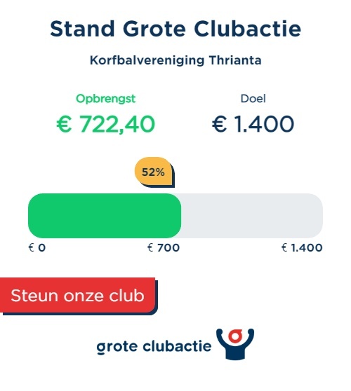 Vorige week zijn we van start gegaan met de Grote Clubactie. Alle jeugdleden hebben een verkoopboekje ontvangen en per e-mail een link naar je persoonlijke verkoop pagina ontvangen.En de eerste tussenstand is overweldigend: er zijn inmiddels al ruim 300 loten verkocht. Dit zijn alleen al de online verkopen en daarmee zijn we nu al halverwege ons streefbedrag. Drie jeugdleden hebben nu al meer dan 25 loten verkochten en zij krijgen vanuit de Grote Clubactie sowieso al de Topverkopers-medaille. Ook zien we al dat de D1, E1 en C2 gezamenlijk koploper zijn in het team klassement. De andere jeugdteams volgen op gepaste afstand. Maar niets is onmogelijk.... de verkoop loopt door tot en met eind oktober. Tip: je kunt jouw persoonlijke verkoop pagina ook via Whatsapp, Facebook en e-mail delen. Check hiervoor jouw mailbox. Ook kun je met deze link https://lot.clubactie.nl/lot/korfbalvereniging-thrianta/40068 jouw verkooppagina onder de aandacht brengen.